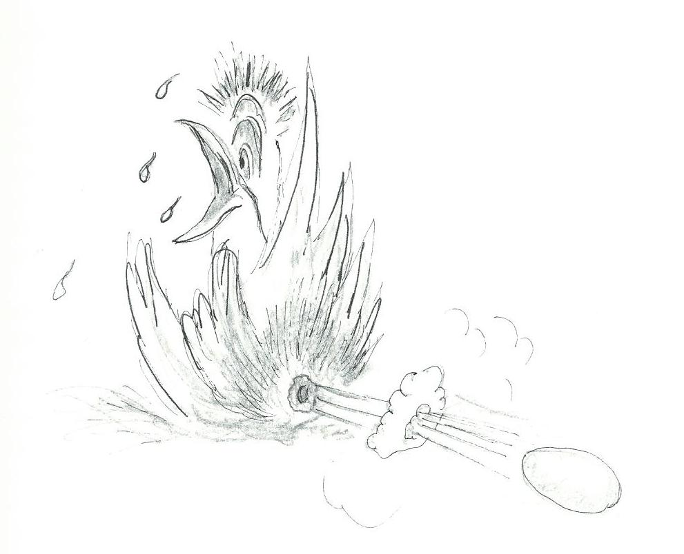 “Bedaankt heur,” koakelt ze en din sloekt ze de wurm in ainmoal deur. Ze kokhaalst dervan, want zo'n dikke wurm wil aiglieks nait in ainmoal deur heur keelgat. Doarom runt ze haard noar de wotterbakke om hom vot te spuilen.