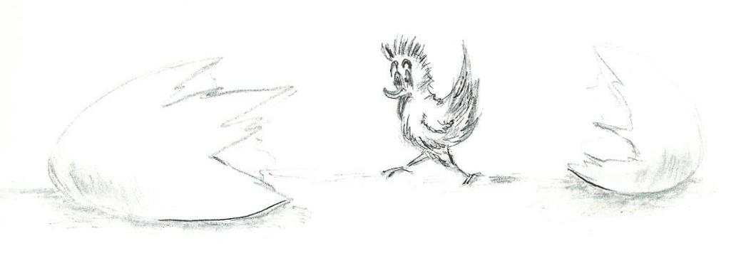 En inains schrikt Nansie. De muren van heur koamertje begunnen te bewegen en valen om. Nansie kin zo mor tou heur hokje uutkroepen. As ze noast heur lutje huuske staait, schudt ze ais mit heur veertjes. Nou ja, veertjes. t Is aiglieks net n soort geel hoar en dat plakt van ale kanten.