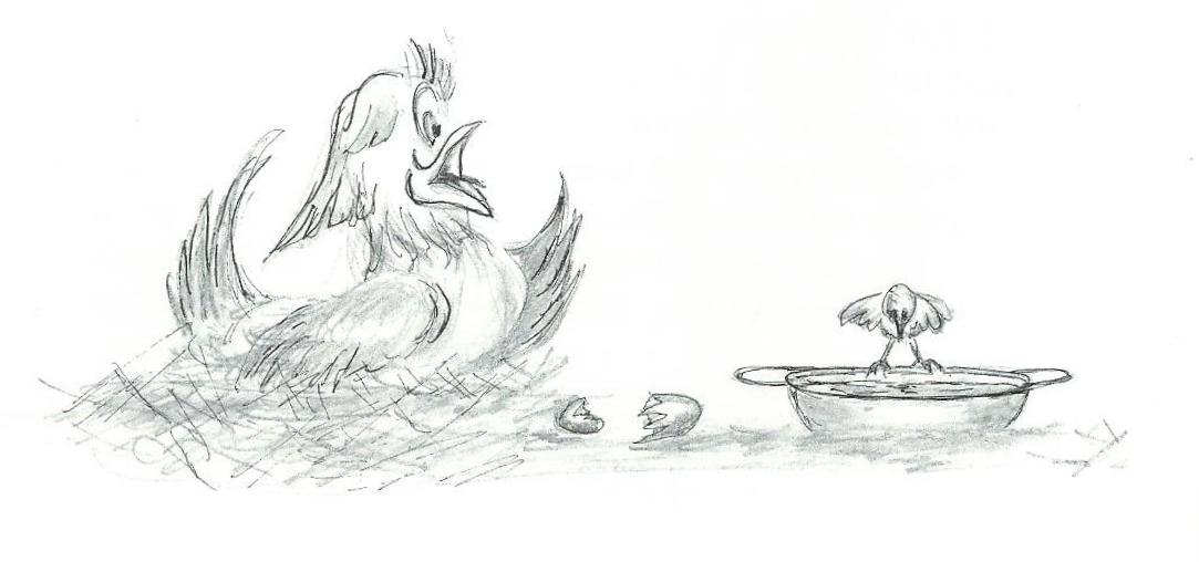Weer pikt ze noar dat vremde kuken. Haar ze dat nou mor nait doan, want doardeur verlust ze heur evenwicht en vaalt ze veurover in de panne mit wotter.