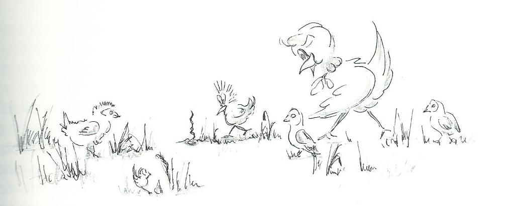 As Moeke wat dichterbie komen is, zugt ze t daaier ook. Ze begunt hail haard te klokken en ale kukentjes komen der aanrunnen.