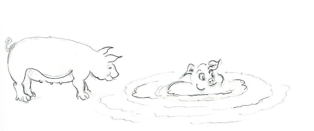 Ze lopen langs t zwienehok. Moeke let heur de zwienen zain en vertelt, dat dat de smeregste daaier binnen dij der bestoan. Ze liggen d'haile dag in de bragel en vinden dat nog schier ook.